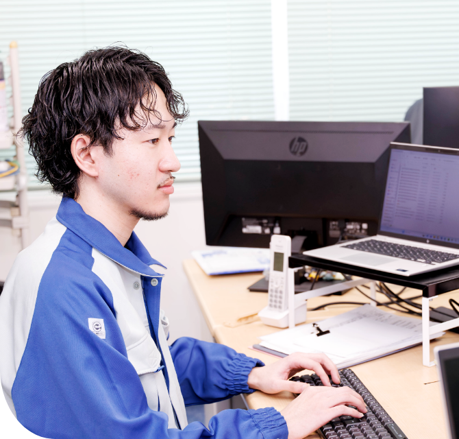 仕事の上で安心できるポイントは、メンター制度が設けられていること。仕事に関する相談はもちろん、生活面の悩みにも気軽に応じてくれます。現在、初めての一人暮らしをしていることもあり、身近に相談できる存在がいることはとても心強いです。こうした職場の落ち着いた雰囲気の中で、事務作業と現場作業の両方への理解を深めながら、肩肘張らずに業務へ集中できています。
